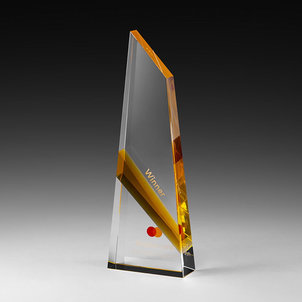 Klares und amberfarbenes Kristallglas verleihen dem Amber Comet ein spannendes Design: eine lebendige Kombination mit Transparenz, Farbe und Tiefe. Ideal für eine plakative Beschriftung durch Lasergravur oder UV-Druck (die Beispiel-Abbildung mit mehrfarbiger Beschriftung ist ein Kundenmotiv und wurde durch UV-Druck umgesetzt)
