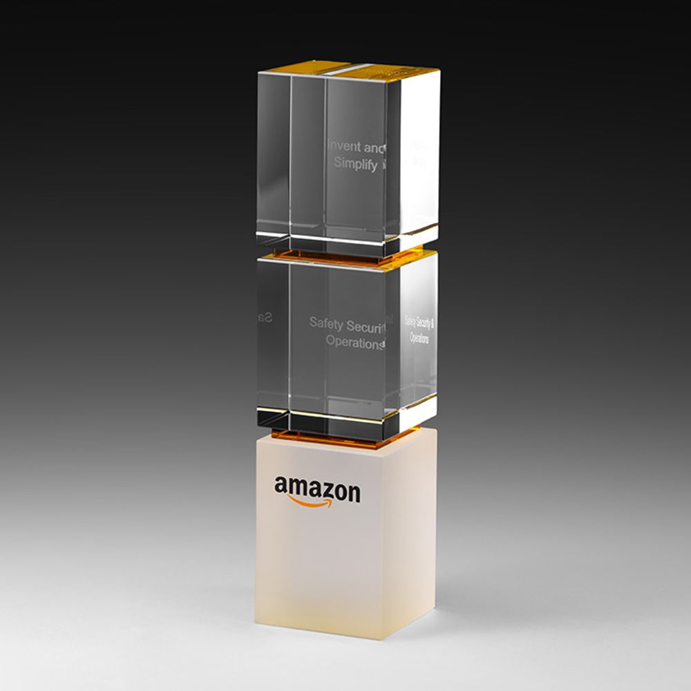 Klares Kristallglas kombiniert mit Elementen aus amberfarbenem Glas verleihen dem Award eine harmonische Präsenz, der weiße Glassockel betont die kraftvolle moderne Optik dieses Designs. Ideal für eine plakative Beschriftung durch Lasergravur oder UV-Druck (die Beispiel-Abbildung mit mehrfarbiger Beschriftung ist ein Kundenmotiv und wurde durch UV-Druck und durch Lasergravur umgesetzt)