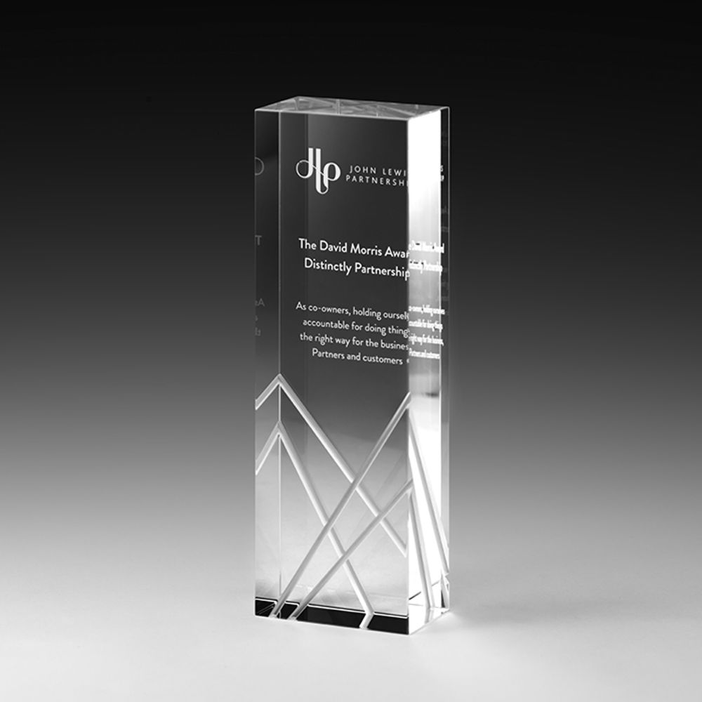 Nach oben geöffnet, von Licht durchzogen: Der Evolution Award steht für Wachstum, Bewegung und den nächsten Schritt. Ideal für eine plakative Beschriftung durch Lasergravur oder UV-Druck (die Beispiel-Abbildung ist ein Kundenmotiv und wurde mit weißer Beschriftung durch Lasergravur umgesetzt)
