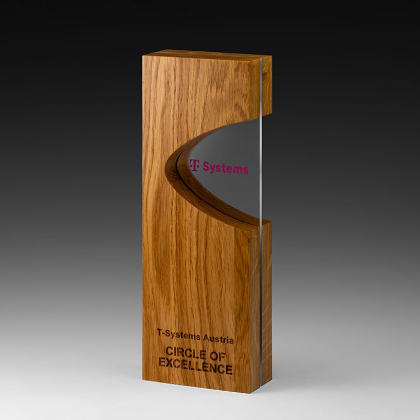 WOODEN AWARDS sind neu in unserem Programm. Die ansprechenden Designs bestechen durch ihre Kombination mit anderen Materialien. Effektvoll dargestellt durch die wunderschöne Einfachheit in der Form. Die Personalisierung erfolgt wahlweise per Lasergravur oder durch Digitaldruck, auch eine Kombination beider Beschriftungsverfahren ist möglich. Die Beschriftung im Bildbeispiel ist durch eine monochrome Lasergravur und mehrfarbigem Digitaldruck umgesetzt.