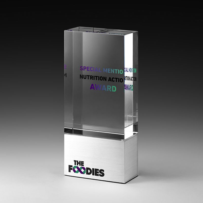 Klar und architektonisch: Massives Kristallglas mit einem präzise gefertigten Aluminiumsockel — eindrucksvoll, hochwertig und souverän. Ideal für eine plakative Beschriftung durch Lasergravur oder UV-Druck (die Beispiel-Abbildung mit mehrfarbiger Beschriftung ist ein Kundenmotiv und wurde durch UV-Druck umgesetzt)