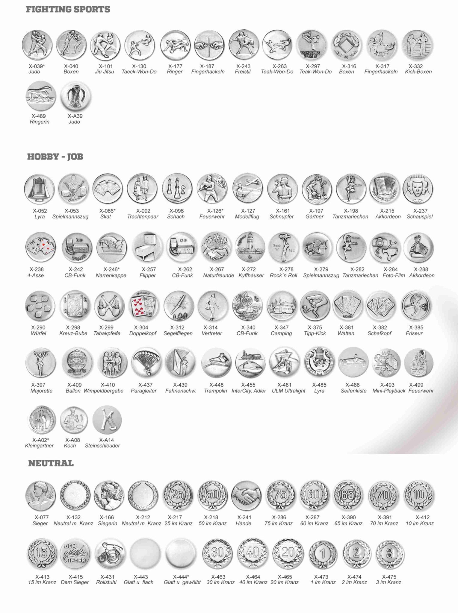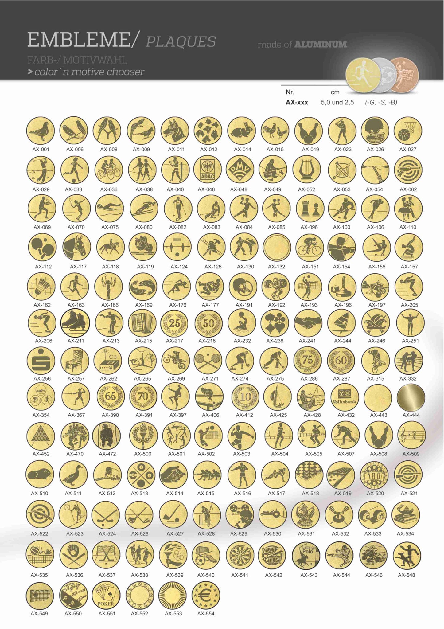 Alle in den 3 Farben gold, silber oder bronze verfügbar: hochwertig gestaltete Reliefembleme in 50 mm Durchmesser, erhältlich in Kunststoffausführung oder aus massivem Metall, die Relief-Metallvarianten der Embleme gibt es jeweils auch als edle Medaille mit Öse. Als Low-Budget-Alternative sind auch Embleme aus feingeprägtem Aluminium erhältlich.