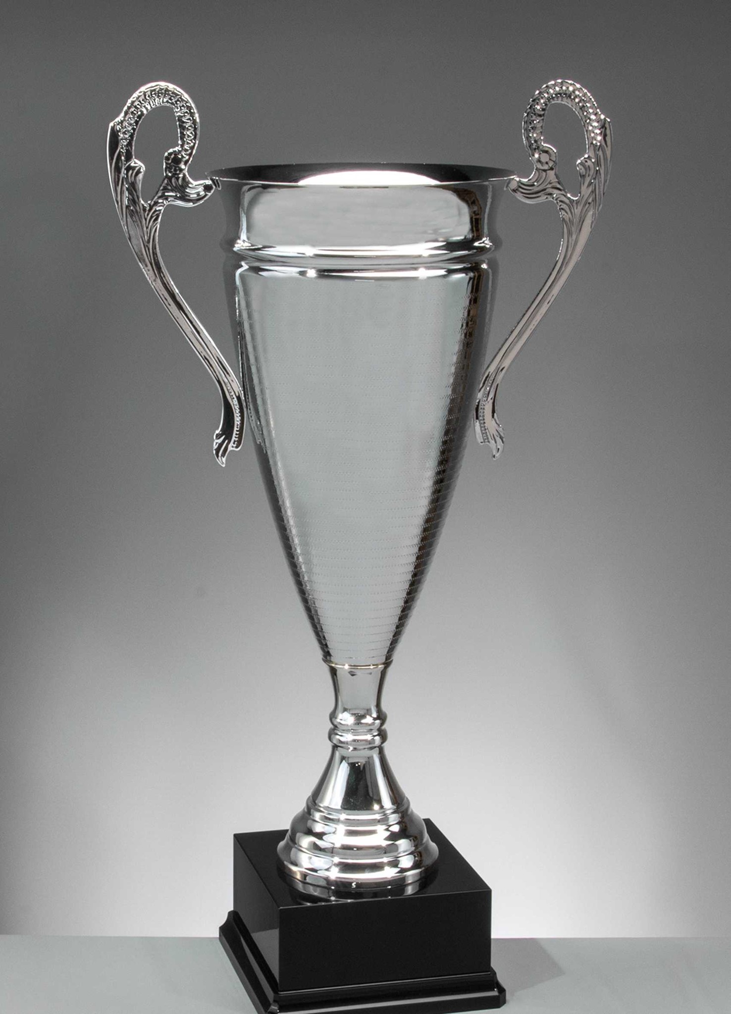 Dieser monumentale Pokal besticht durch seine hohe lange Metall-Schale, die mit einer markant ziselierten Designstruktur und der klassischen Henkelform veredelt ist. Dieser Pokal hat eine Höhe von 75,5 cm.Der große Sockel bietet viel Platz für Ihre Gravuren.