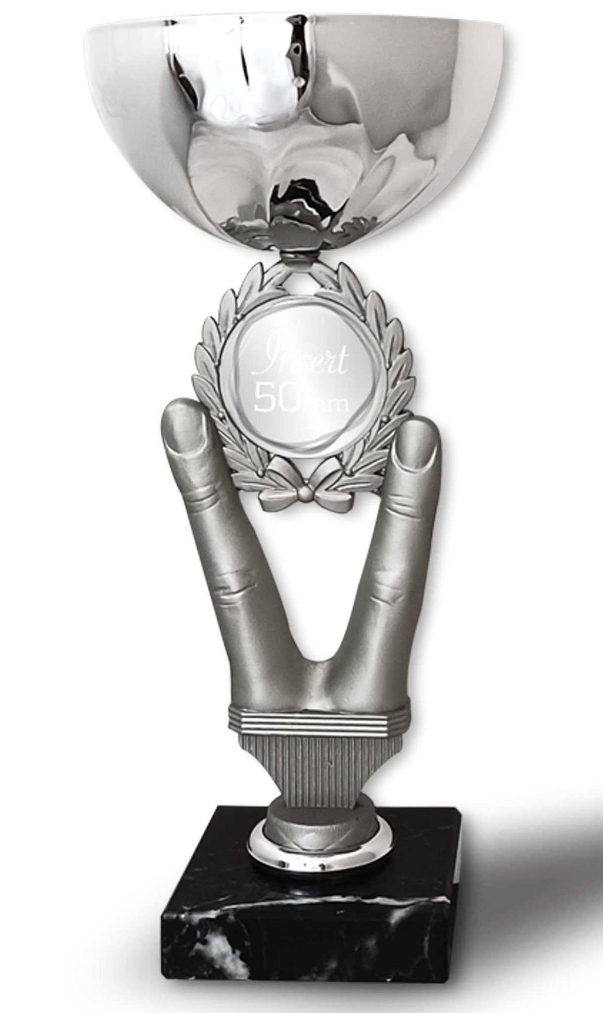 Dieser edel silberfarbig lackierte Pokal ist mit goldfarbigen Akzenten versehen. Der Emblemhalter ist goldfarben und aus Metall und für ein 50mm Emblem geeig...